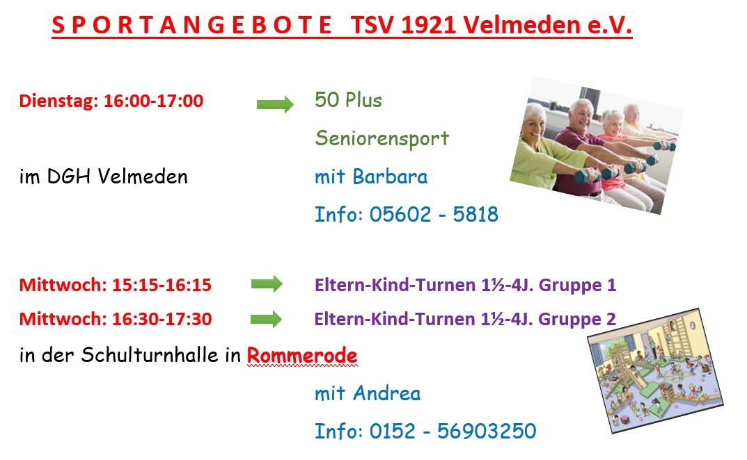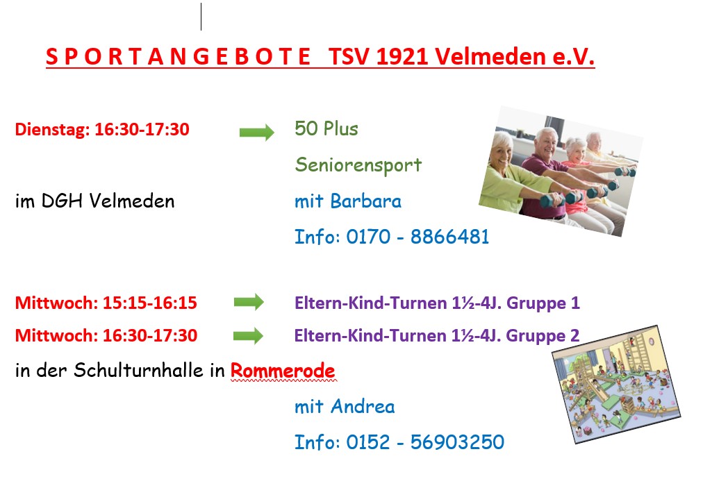 Auf unserer Homepage findet ihr viele Informationen zu unserem Verein, unseren Gruppen, Angeboten und Veranstaltungen. Jeder kann an der Gestaltung dieser Seiten mitwirken, ein E-Mail an info@tsv-velmeden.de genügt.