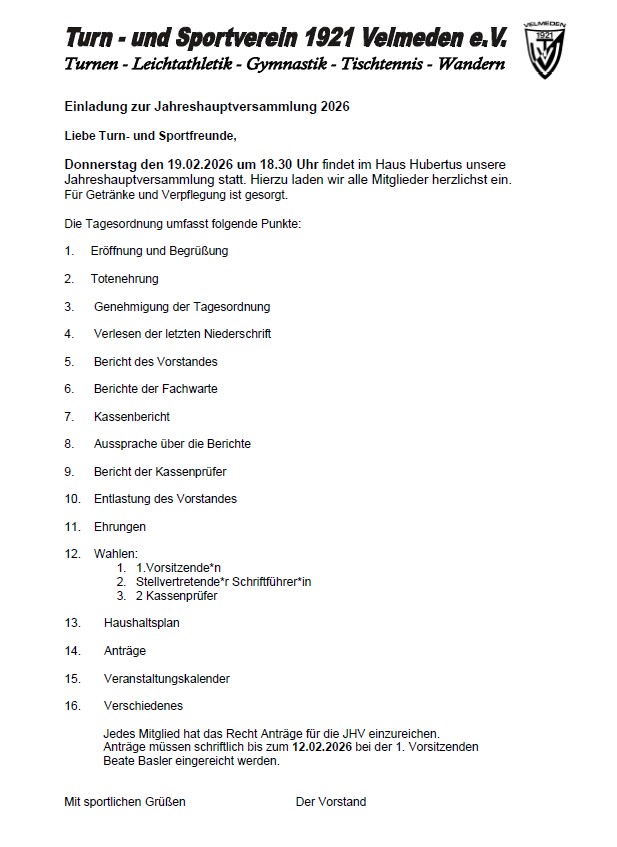 Einladung zur Jahreshauptversammlung des TSV Velmeden 1921 e.V. am Donnerstag 19.02.2026 ins Haus Hubertus um 18.30 Uhr!